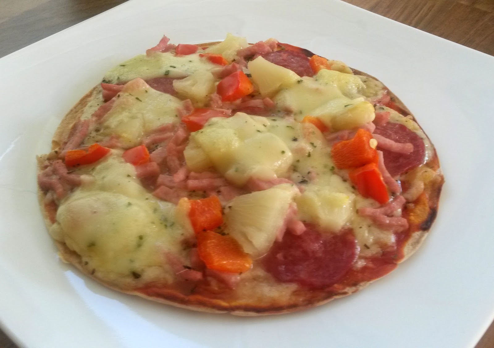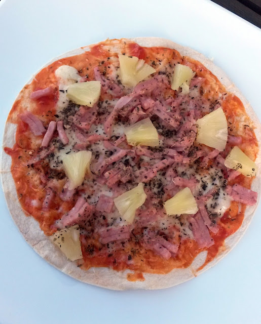 Ja minu nn õhtusöögipitsa, mis toitvam tuli ja mul oli tõsine raskus selle söömisega koosnes tortillast, tomatipastast, pitsamaitseainest, riivjuustust, poolsuitsuvorstist, pitsakattest, paprikast, ananassist ja kõige peale veel mozarella juust.