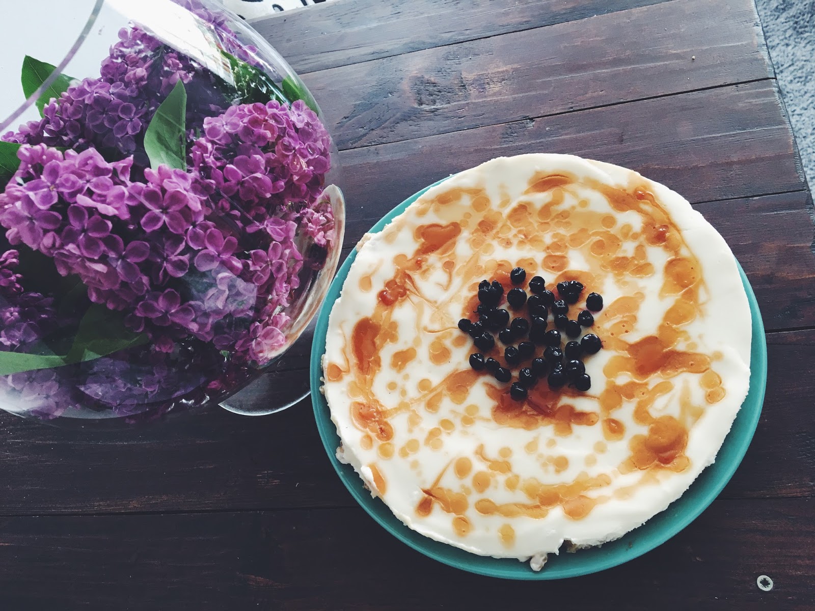 Umbes tund-kaks hiljem kui kook oli ka kapis juba tahenema hakkanud sulatasin pannil natuke suhkrut karamelliks ja seejärel niristasin puulusikaga saadud segu koogile. Suhkru kogust ei oska anda, kuna tegin suurema koguse, millest ülejäänuga tegin karamellkisselli. Ning enne söömist lisasin ka mõned ülessulatatud mustikad koogile.