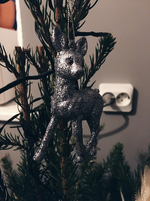 Kuusekülge läksid sooja-külmavalgusega segalambid ja kahes erinevas suuruses (väiksemad sädelevad pruunikad-kuldsed kuulid ja mõned suuremad kuldsed-valged kuulid) ning olen kokku ostnud selliseid erinevaid "mänguasja" stiilis kuuseehteid, mis minu arust vähemalt teevad kuuse nunnumaks. Tegelikult on piltidel kuusk natukene halva küljega saanud (pidime taldriku alla tõstma) ja vasakule on selline auk tekkinud - tegelikult õnneks seda märgata pole. Aga eks nii juhtub kui osta võrgus kuuske, mida alles võimalik näha kodus.