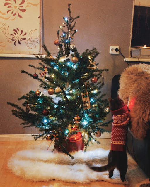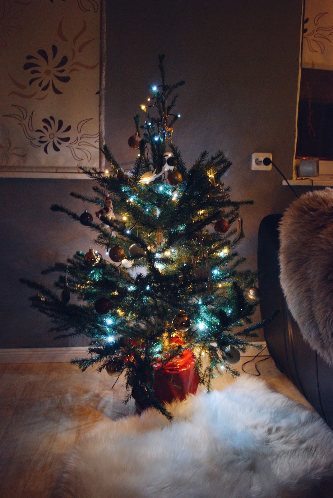 Me (minu soovil) tõime see aasta kuuse päris vara tuppa - minu jaoks on see esimene minu enda päris kuusk, et sain ise valida kuuse mida osta kui ka ehted, mida kuusele panna. Kuna ka kuuse nii vara tuppa tõime (ja meil on kass) sai kriteeriumiks see, et kuusk oleks potis. Tegelikult oli potikuuske päris raske leida, kuid lõpuks tuli ka väike valik neid Tartu Bauhofi müüki ja kannatamatu nagu ma olen nii kui seda märkasin läksin kuusele järgi. Ma viskasin küll sildi ja tšeki ära, aga peaks olema Serbia kuusk.